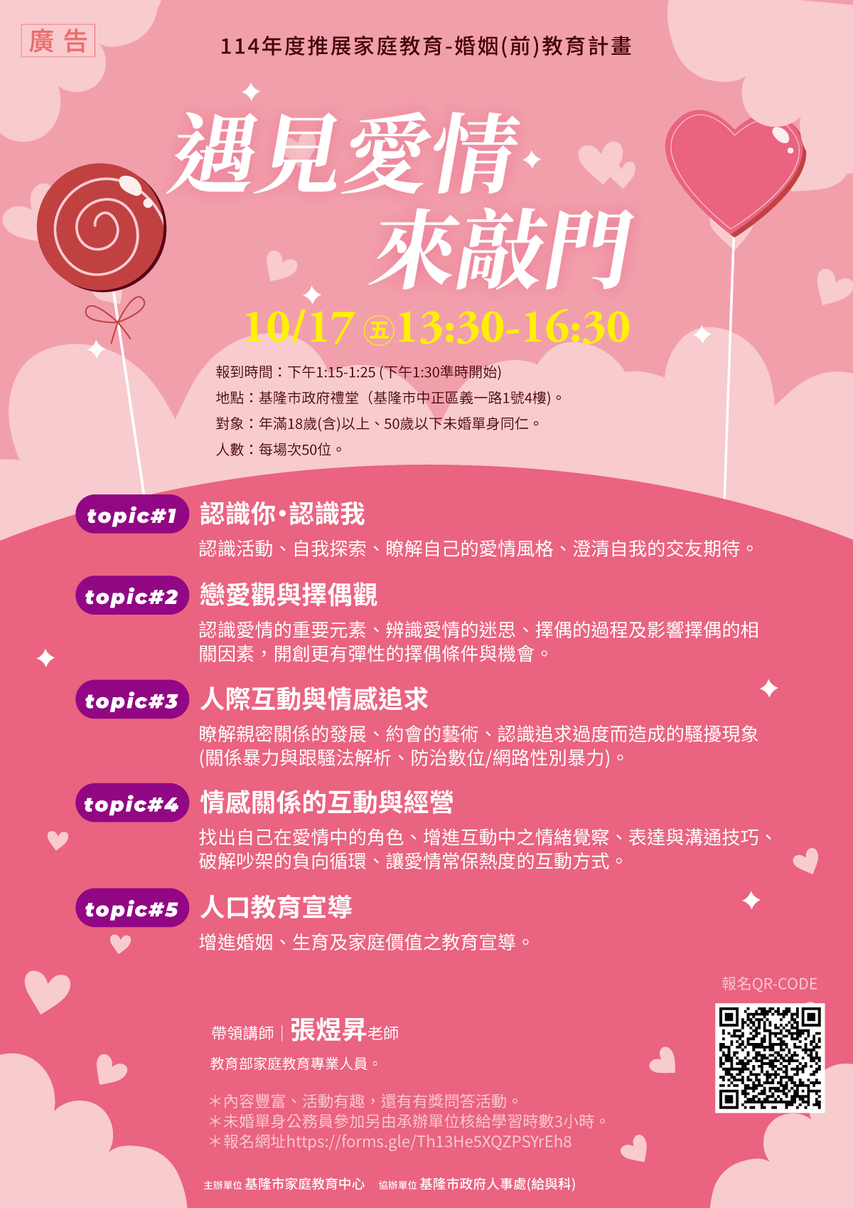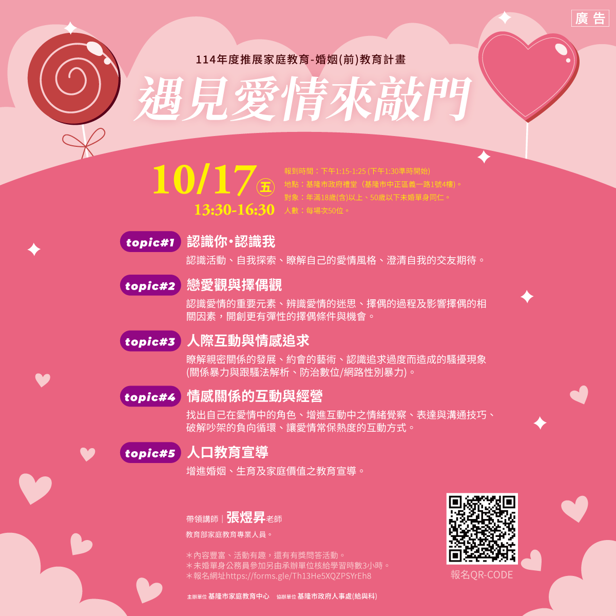 轉知基隆市家庭教育中心與基隆市政府府人事處(給與科)合作辦理「遇見愛情來敲門」(第2場),請未婚單身同仁踴躍報名參加。